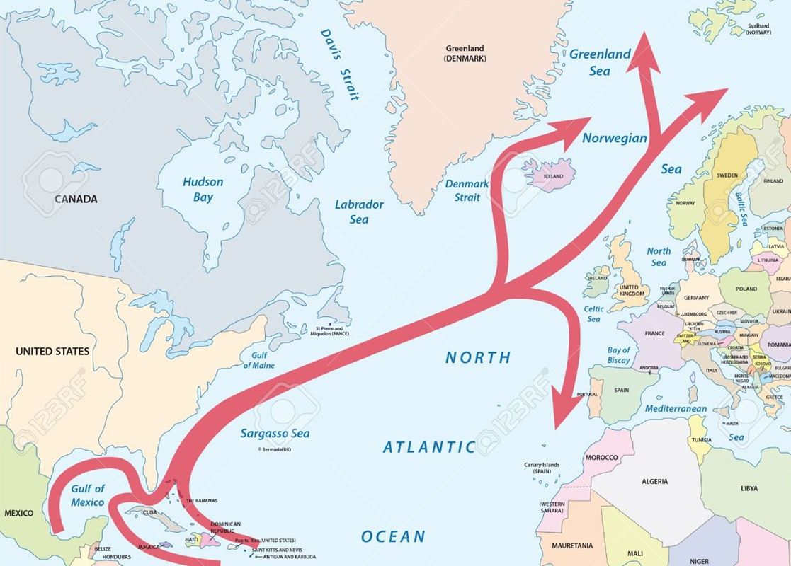 De manera similar, la Corriente del Golfo se ve afectada por el derretimiento del hielo ártico , que arroja grandes cantidades de agua fría al sur de Groenlandia, interrumpiendo el flujo del AMOC. Los impactos de las variaciones en la Corriente del Golfo se observan durante períodos mucho más largos que las variaciones en la Corriente en Chorro, pero también traerán un clima más extremo a medida que el clima se calienta. Además de provocar un clima más extremo en Europa y la costa este de los EE.UU, el debilitamiento del AMOC podría tener graves consecuencias para los ecosistemas marinos del Atlántico, alterando las poblaciones de peces y otras formas de vida marina.